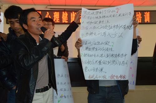 培訓通過參與式授課和實踐操作相結合的方式進行。在授課環節,陶勑恒教授對學校心理健康教育的基本途徑、心理健康教育課程的基本理念與設計作了講解,闡述了以人為本的心理健康教育原則,提出“原則比技術重要”的思想,對中小學心理健康教育的理念做了深層次的剖析。楊偉從心理健康課的準備、現場演練、操作方法做了現場示范,講解了中小學心理健康課從設計到實施和研討的具體操作流程,使參訓教師學習到了中小學心理健康課程的具體操作技能。參訓的心理健康骨干教師對中小學心理健康教育從理念到可操作性上都有了清晰的認識和體驗。培訓結束后,陶勑恒教授同楊偉又來到心理援助工作站龍泉中學示范校開展了一堂主題心理輔導課,更進一步地增強了大家對從事心理健康教育和開設心理健康課程的理解。