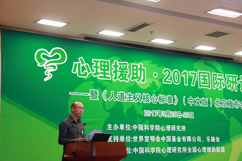 5月25至26日,由中國科學院心理研究所(以下簡稱“心理所”)主辦,世界宣明會中國基金有限公司和樂施會支持,心理所全國心理援助聯盟承辦的“心理援助?2017國際研討會暨《人道主義核心標準》(中文版)北京發布會”在心理所召開,中科院領導、基金會、民辦非企業、社會企業、境外非政府組織等代表、心理援助專家和志愿者代表約120余人參加此次研討會。開幕式由全國心理援助聯盟副主席劉正奎主持,心理所黨委書記、副所長孫向紅致開幕辭。