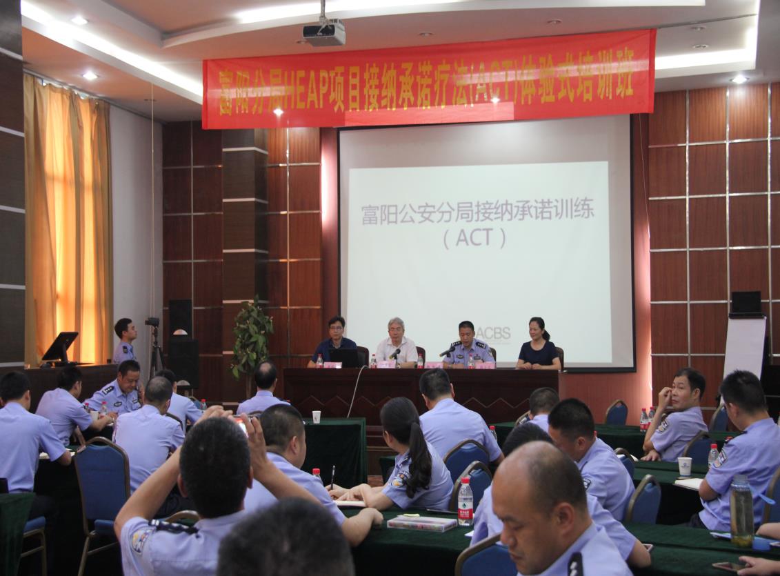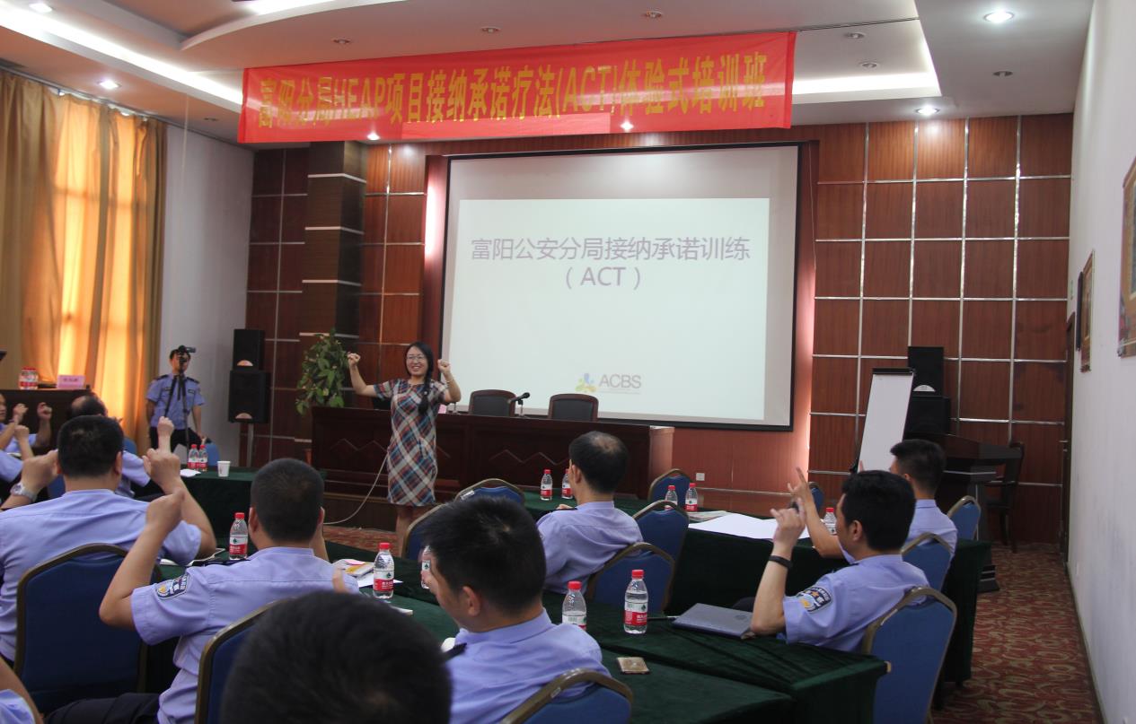 心理所國家公務員心理健康應用研究中心主任祝卓宏教授、培訓主管盧敏博士聯合五云山療養院HEAP中心張小蘭主任為富陽公安分局40余名教導員及政工干部進行了為期兩天的接納承諾訓練(ACT)體驗式培訓和心理訪談。張小蘭主持開班式,杭州市公安局富陽分局黨委委員、政治處主任邵志勇進行開班動員,杭州市公安局政治部主任科員趙杭敏和祝卓宏出席開幕式。