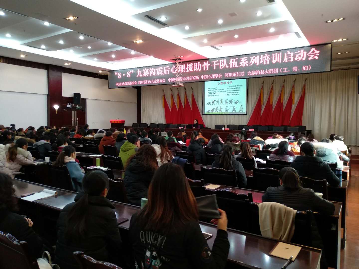 2月5日,中國科學院心理研究所全國心理援助聯盟在中國婦女發展基金會、四川省婦女兒童基金會、阿壩州婦聯和九寨溝縣大群團(工青婦)的支持下,在四川省阿壩州九寨溝縣聯合開展“8?8”震后心理援助骨干隊伍系列培訓,該系列培訓旨在促進當地組建心理援助婦女干部骨干隊伍,科學引導當地心理援助工作實現可持續發展。四川省婦女兒童基金會秘書長徐麗娜、九寨溝縣人民政府副縣長、婦兒工委辦主任陳志敏、九寨溝縣婦聯主席徐蘭、心理所全國心理援助聯盟副主席、應用發展部主任張莉和聯盟秘書長吳坎坎出席本次啟動會,來自九寨溝縣婦聯、共青團和教育系統的120余人參加啟動會。