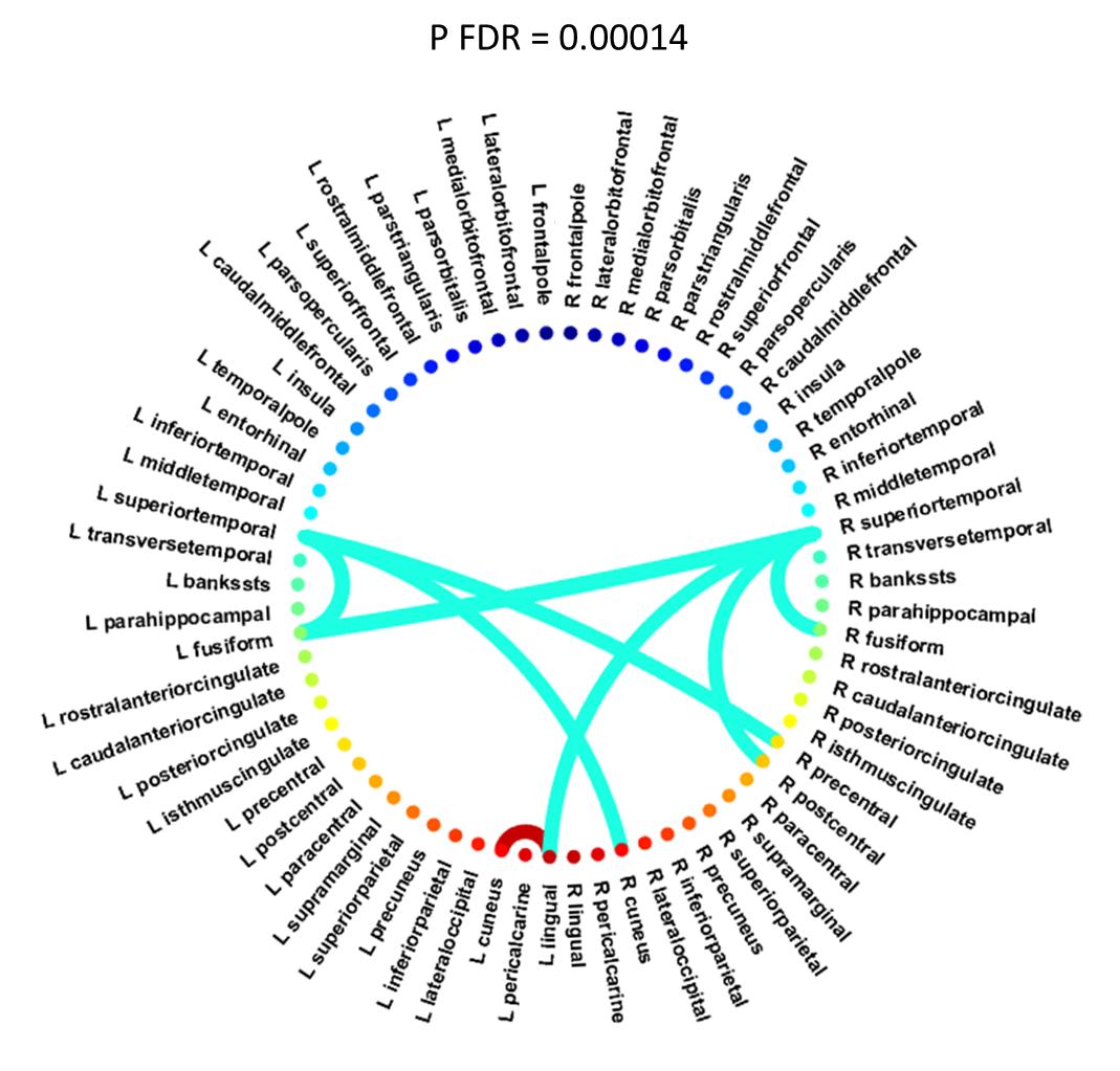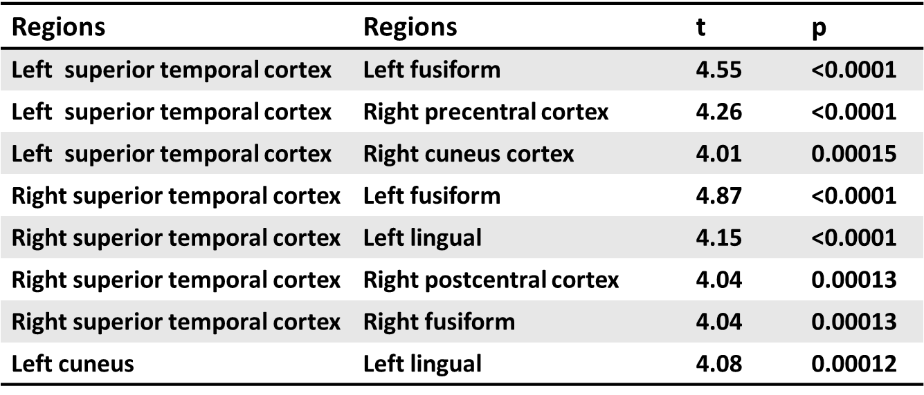 通過對不同皮層區相互配對的信號分析互信息,共檢測了2278個連接,發現病人的互信息普遍降低,然而只有8個連接通過FDR驗證,仍保持顯著性 (圖1)。有意思的是,顳上皮層和背側前額葉、扣帶、顳葉及頂葉皮質區的互信息與PANSS陽性癥狀和幻覺相關,但這些顯著性沒有通過FDR多重驗證。