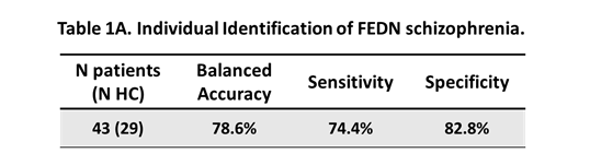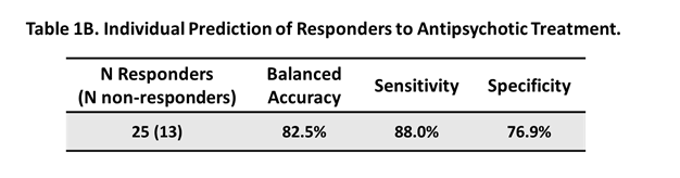 在利培酮治療10周后,研究者進一步隨訪病人。PANSS總分和三個分量表評分均顯著性降低。以PANSS總分降低30% 為好轉標準,同時以皮層間功能連接的相關性組成回歸模型,結果發現回歸模型能預測PANSS總分降低的百分比(r=0.69; p<0.0001)。依據這個預測性的PANSS百分比降低,能預測88.0% 的治療好轉病人,和76.9% 的無效病人(平衡精確度82.5%) (Table1B)。