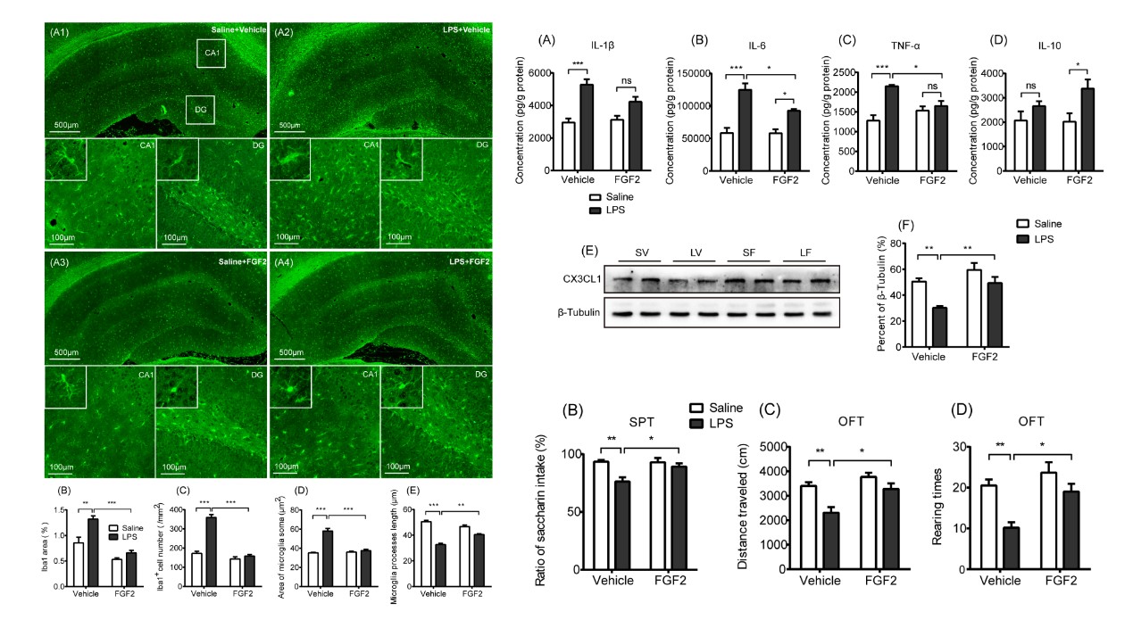 圖1. FGF2逆轉了由炎性免疫導致的抑郁樣行為及小膠質細胞和神經-免疫調節因子的變化