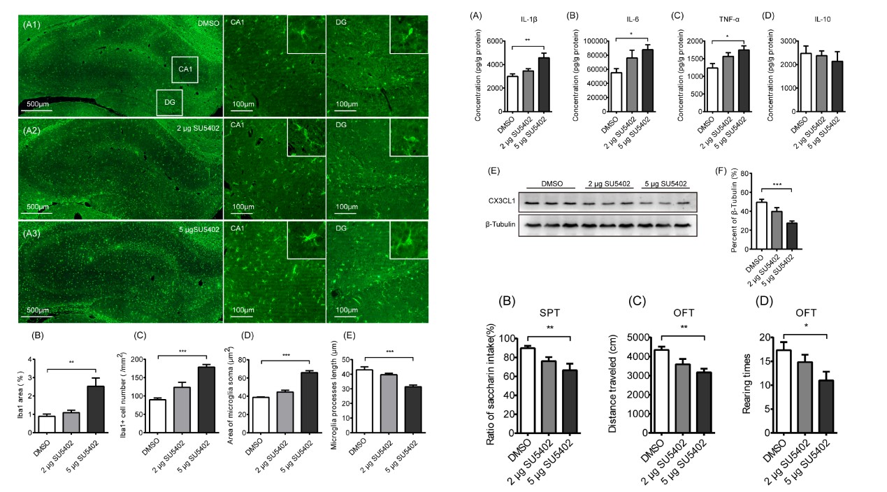 圖2. FGFR抑制劑(SU5402)誘發了抑郁樣行為,激活了小膠質細胞, 促進了炎性細胞因子的分泌,降低了神經-免疫調節因子CX3CL1的表達