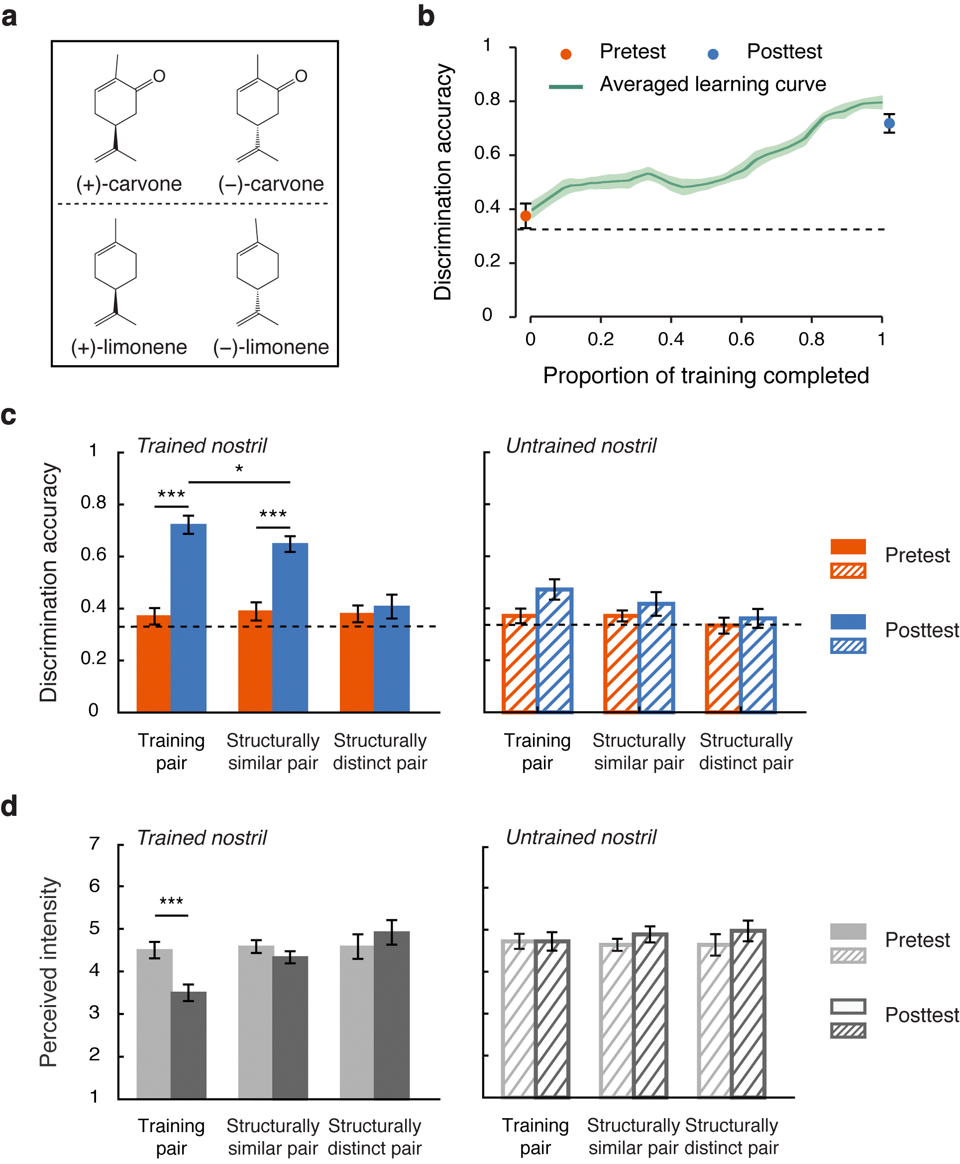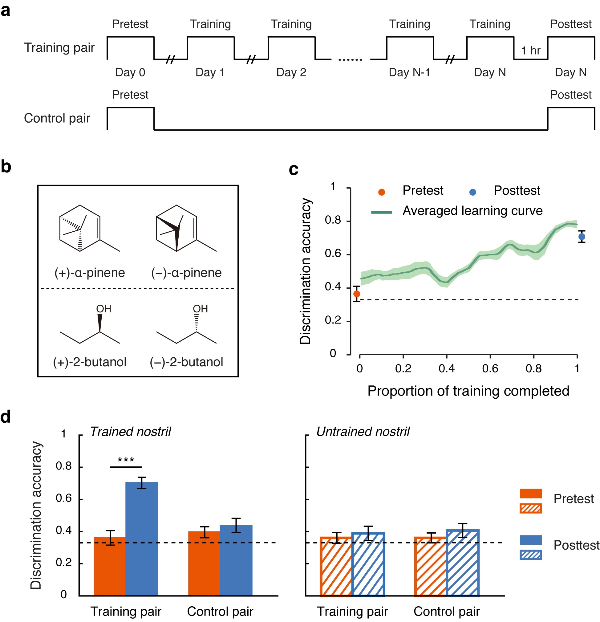研究包括兩個實驗,流程如圖1a所示。訓練開始前,研究者評估了受試者鼻兩側對不同手性氣味對的手性分辨能力(前測)。在訓練中,僅向受試者鼻子一側反復呈現一對手性分子(training pair),要求分辨,并給予即刻反饋。訓練持續多日(平均10-11天),直到受試者的分辨正確率連續兩天達到75%或以上為止。隨后,研究者評估了受試者鼻兩側對訓練的氣味對和未經訓練的氣味對(control pair)的手性分辨情況(后測)。