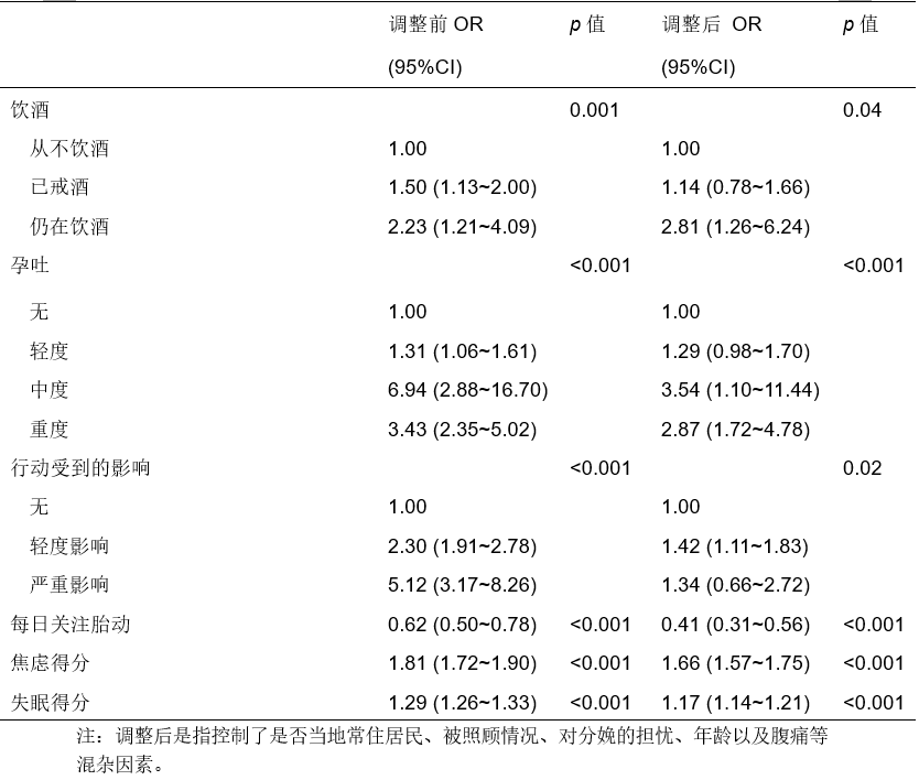 研究結果顯示,新冠肺炎疫情集中爆發之后,孕產婦的抑郁發生率為35.4%。在眾多臨床變量以及人口學變量中,焦慮、失眠、飲酒、孕吐、疫情期間懷孕對行動的影響程度是導致孕產婦抑郁的危險因素。同時,每日關注胎動成為孕產婦抑郁的保護因素。換言之,在懷孕期間每天關注胎動的孕婦,出現抑郁的可能性較小。