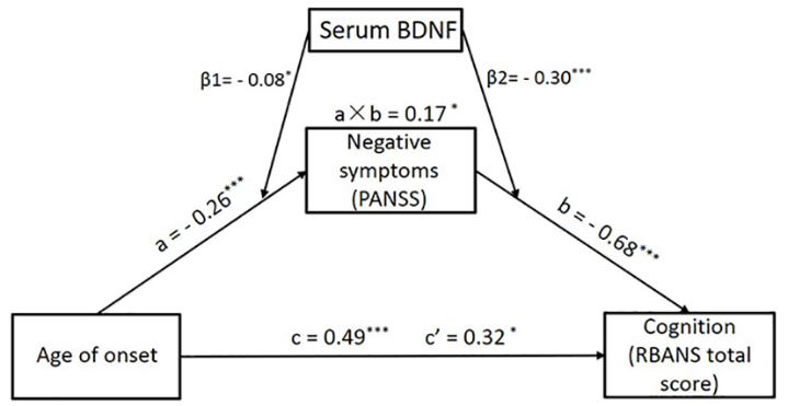 Xu H, Wang J, Zhou Y, Chen D, Xiu M, Wang L, Zhang X. BDNF affects the mediating effect of negative symptoms on the relationship between age of onset and cognition in patients with chronic schizophrenia. Psychoneuroendocrinology. 2020 Dec 26;125:105121. doi: 10.1016/j.psyneuen.2020.105121. Epub ahead of print. PMID: 33387927.