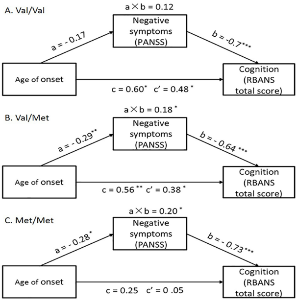 另外,有調節的中介分析表明,陰性癥狀部分介導了發病年齡與認知功能之間的關系,而血清BDNF可調節這種關系(圖1)。陰性癥狀的介導作用表現出Met等位基因劑量依賴性的趨勢(圖2)。這些結果表明,在不同的血清BDNF水平和BDNF Val66met多態性下,精神分裂癥的發病年齡,認知功能和臨床癥狀表現出不同的關系。