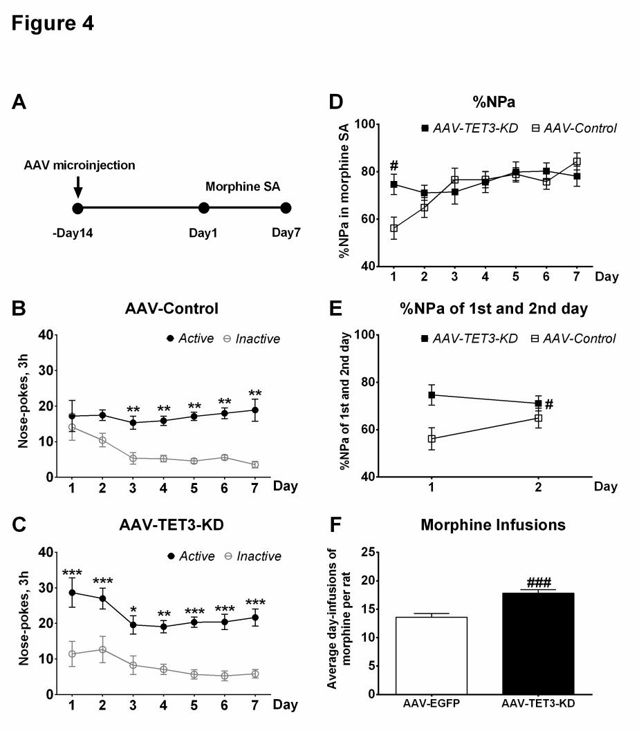 研究發現:嗎啡自給藥訓練1天后,海馬CA1區(而非伏隔核殼區NAc Shell)中的TET3蛋白表達顯著升高;訓練7天后,CA1區TET1蛋白表達顯著降低(見圖1)。CA1中特異性敲減TET3的表達能增強嗎啡自給藥行為的獲得(見圖2),而CA1中特異性過表達TET1能有效抑制獲得。