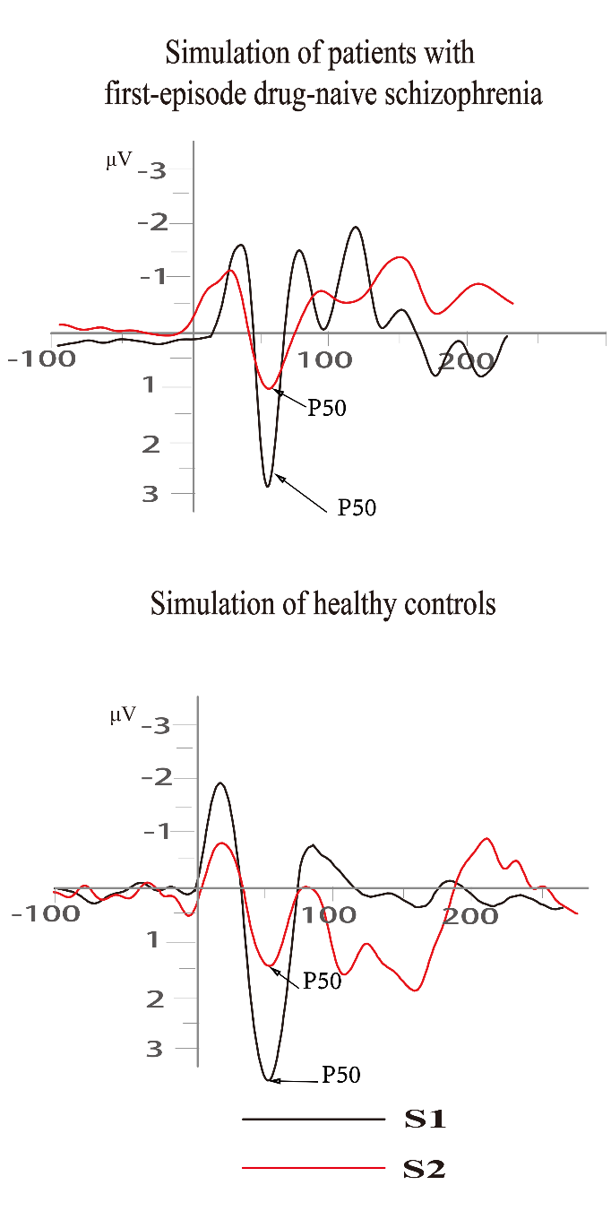 抑制機制和感覺門控通常通過條件-測試P50范式進行評估,其中成對的“click”刺激以500ms的間隔出現,引起大腦中的正極性反應,該反應發生在刺激開始后約50ms。第一個刺激稱為條件反射刺激(S1),第二個刺激稱為測試刺激(S2)。在精神分裂癥患者中反復發現較高的P50門控率,提示重復刺激的抑制機制存在缺陷。然而,在精神分裂癥患者中,P50感覺門控與精神病理學癥狀以及認知功能障礙之間的聯系尚不清楚,針對中國人群,尤其是首發未服用藥物的精神分裂癥患者,進行P50感覺門控與精神病理學癥狀以及認知功能障礙的研究較少。
