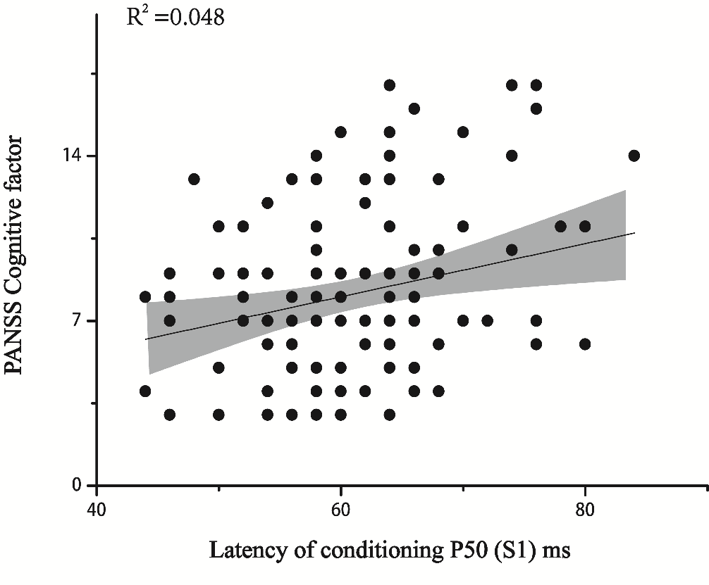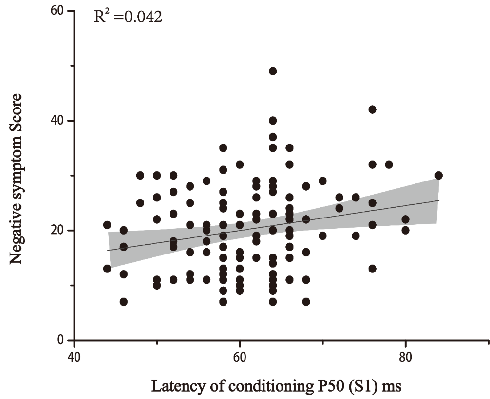 結果表明,與正常對照組相比,精神分裂癥患者存在著P50感覺門控缺陷,首發精神分裂癥患者的P50成分具體表現為,P50差值降低,S1、S2潛伏期延長,S1、S2波幅降低(如圖1)。進一步研究發現,在精神分裂癥患者中,S1潛伏期與PANSS陰性癥狀或認知因素(如圖2)、P50比值與一般精神病理和PANSS總分(如圖3)、P50差值與一般精神病理和PANSS總分(如圖4)之間均有顯著相關。多元回歸分析顯示,S1潛伏期、性別、年齡和教育程度是陰性癥狀評分的影響因素。S1潛伏期、S2潛伏期、性別、年齡和吸煙狀況是認知因素的影響因素。研究結果提示,首發未服藥的精神分裂癥患者的P50感覺門控缺陷與精神病理學癥狀以及認知缺陷均存在相關。