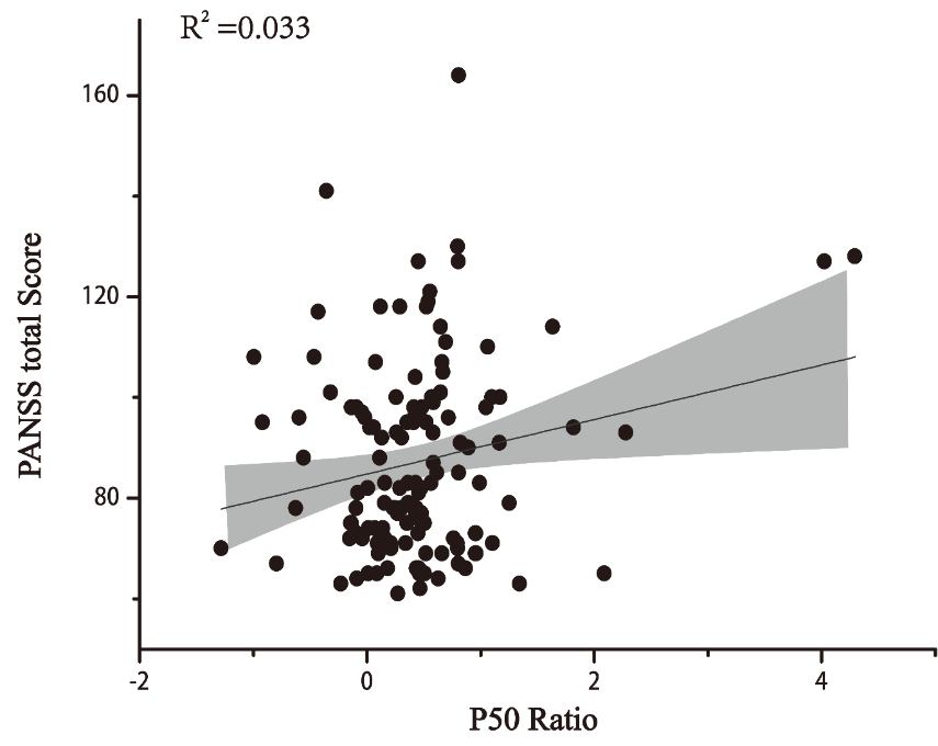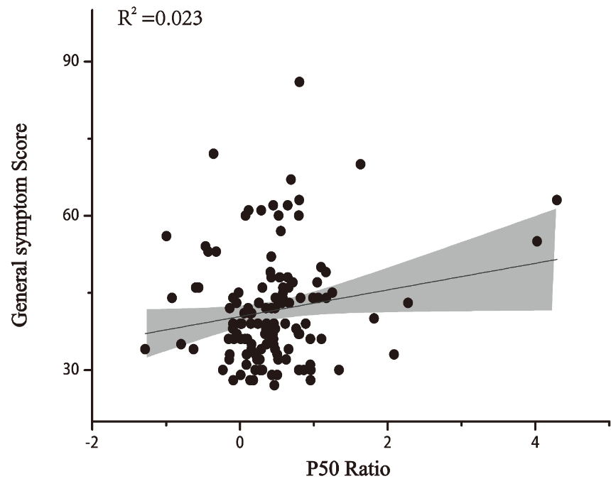 圖3 P50比率與PANSS一般精神病理學癥狀和總分之間呈正相關