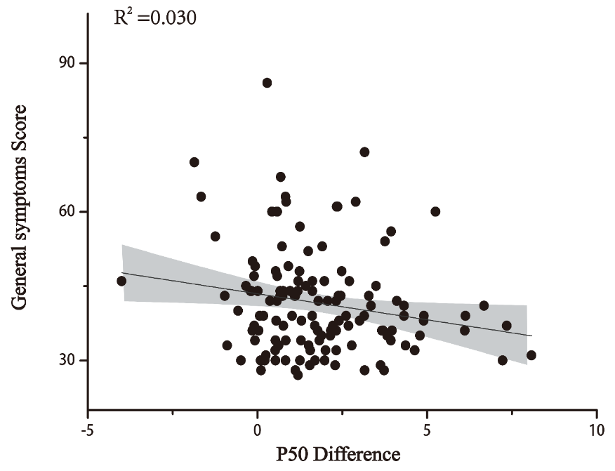 圖4 P50差值與PANSS一般精神病理學癥狀和總分之間呈負相關