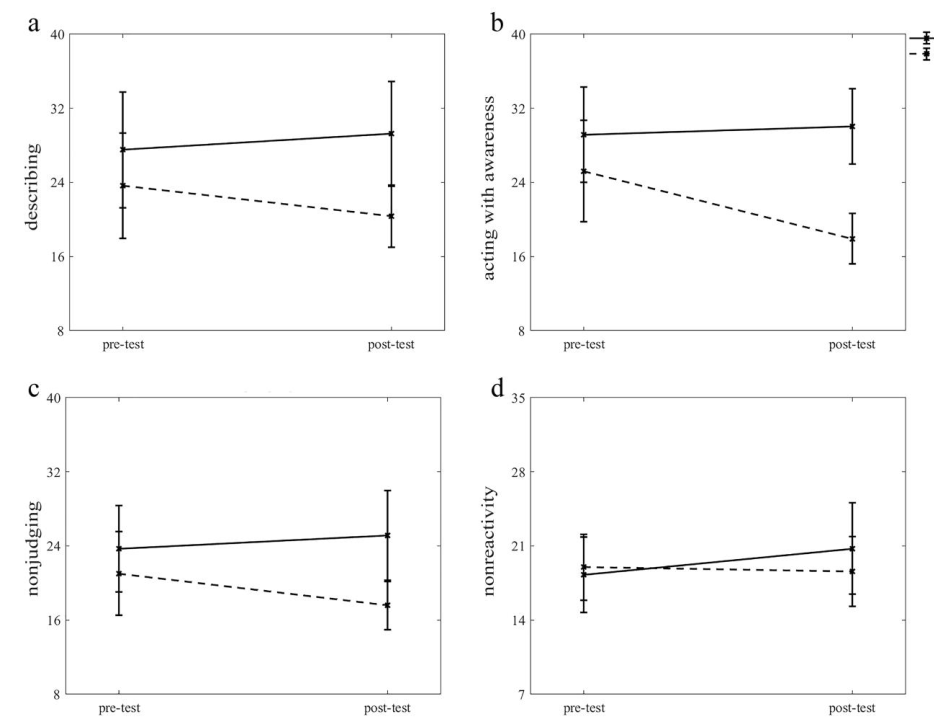 研究招募了61名健康成年人被試,分為太極拳組和不參與任何鍛煉的對照組。太極拳組被試進行了每周3次,每次1小時,持續8周的簡化14式太極拳學習。在干預開始前、結束時以及鍛煉結束16周后,通過《五因素正念量表》及《多維度內在感受性量表》測量所有被試的正念及內在感受性水平。