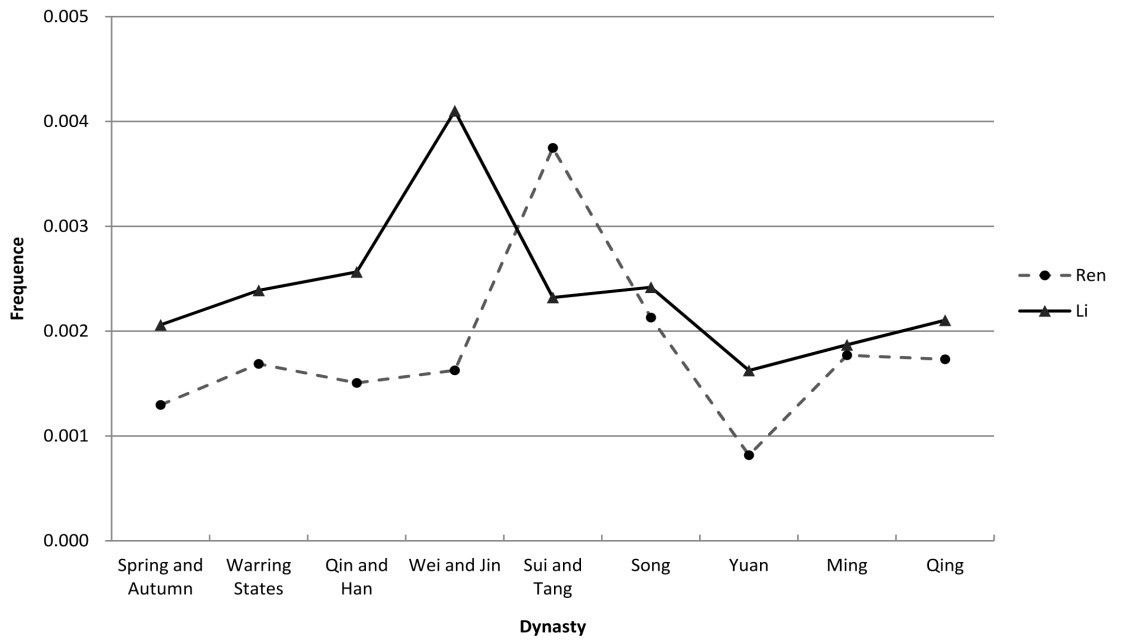 該研究采用的工具是研究組自主開發的古文CC-LIWC詞典。通過運行詞典主程序,計算“仁”和“禮”在各朝代(時期)儒家典籍中的詞頻均值,以折線圖的方式展示了從春秋至清朝“仁”“禮”變遷情況(見圖1)。