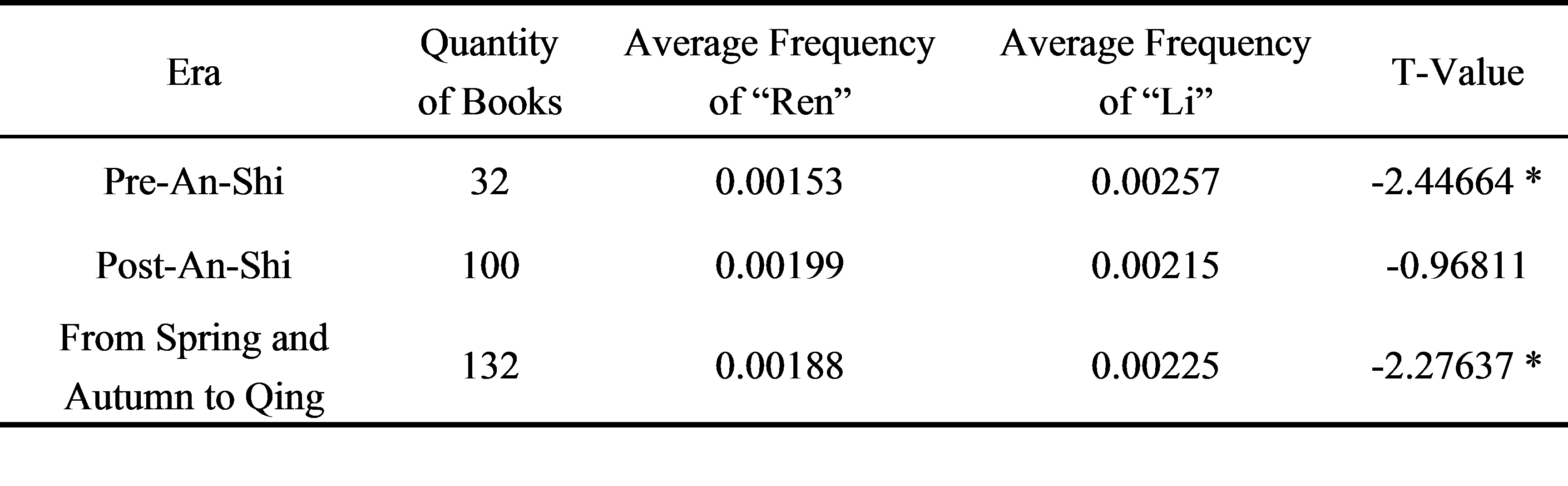為了進一步分析 “仁”和“禮”在不同儒家典籍中受重視程度。研究人員將唐朝安史之亂作為分割點,分安史之亂之前、安史之亂以后,春秋至清朝三個時間段,對各儒家典籍中的“仁”“禮”詞頻做均值差異檢驗(見表2)。