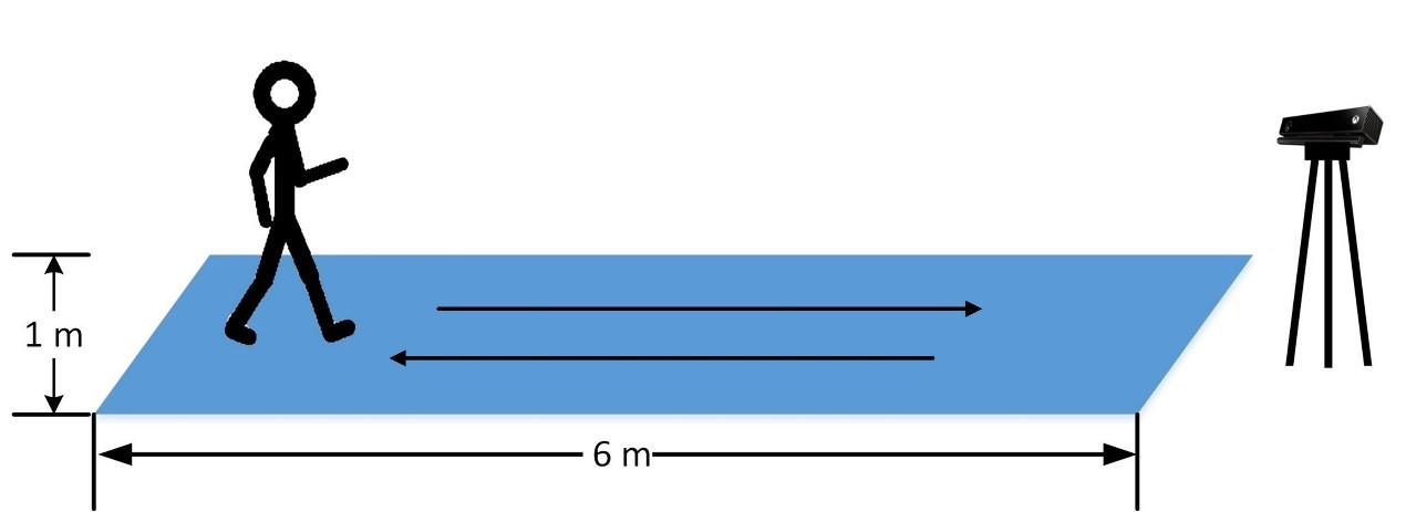 該研究共招募了126名抑郁癥患者和121名健康者。病例組為市屬某精神衛生醫療機構的抑郁癥患者,其診斷結果是由精神科醫生根據《精神障礙診斷與統計手冊》完成的。對照組是從社會招募的健康人群。所有被試在6米*1米的人行道上自然地來回行走兩分鐘,放置在一端的Kinect智能體感設備記錄下其步態數據(圖1)。