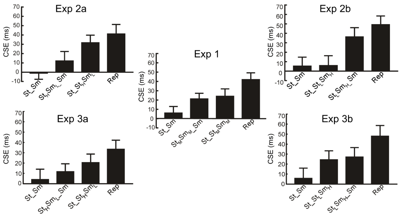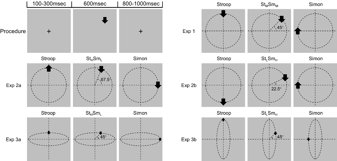 具體而言,研究者利用空間Stroop-Simon任務的正交性,增加了一種中間類型的混合沖突(StSm),這一沖突與Stroop(St)或Simon(Sm) 之間均存在一定的相似性,相似性的大小通過箭頭與中心的夾角(實驗2a和2b)或箭頭與中心的距離(實驗3a和3b)來調節。