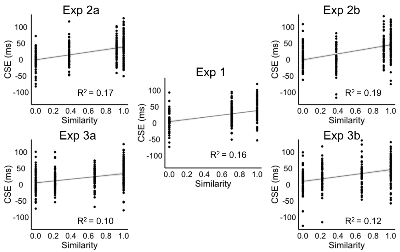 結果發現,當沖突之間的相似性越大,兩種沖突之間的一致性序列效應也越大。沖突相似性可以線性調節一致性序列效應的大小。另外,研究結果也說明沖突之間的一致性序列效應不是全(顯著大于0)或無(不顯著)的,而是連續的。這些結果為整合的認知控制學習理論提供了強有力的證據。