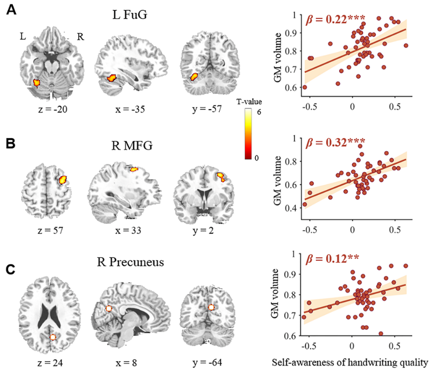 結果發現,人們通常會高估自己的書寫質量,而且,男性高估的程度要顯著高于女性。腦結構-行為相關分析發現,個體對書寫質量的自我估計準確程度與大腦左側梭狀回、右側額中回和右側楔前葉三個腦區的灰質體積呈正相關。左側梭狀回和右側額中回屬于書寫加工腦網絡,在其他領域中并沒有報告,可能代表了書寫元認知的特異性腦機制,而右側楔前葉在記憶與知覺元認知研究中也有報告,反映了一種領域一般性的元認知腦機制。