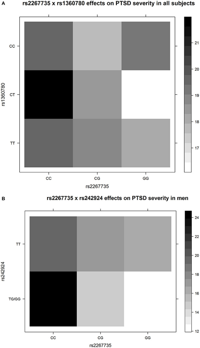 每個單元的顏色根據受試者的 PTSD 嚴重程度的平均值填充,并代表相應的特定基因型組合。(A)顯示所有受試者的rs2267735 × rs1360780,(B)顯示男性的 rs2267735 × rs242924。由于只有三個人有 rs242924 基因型 GG,因此我們合并了 GG 和 TG。數字表示上位性大小。例如,在(A), 對于 rs1360780 基因型 CC 的被試,rs2267735 的次要等位基因 G 與 PTSD 嚴重程度無關;對于具有 rs1360780 基因型 CT 和 TT 的被試,rs2267735 的次要等位基因 G 對應于 PTSD 嚴重程度的降低。圖形由 R3.4.4 繪制。