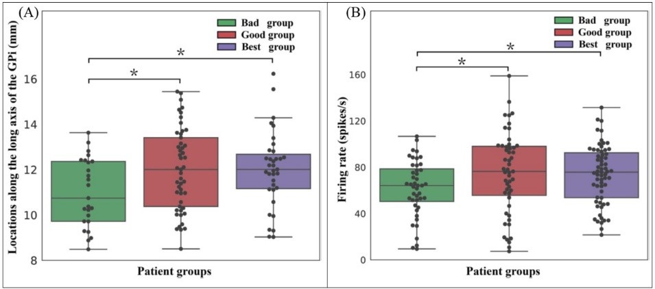 (B)不同療效組的GPi神經元平均發放率(*p < 0.05)