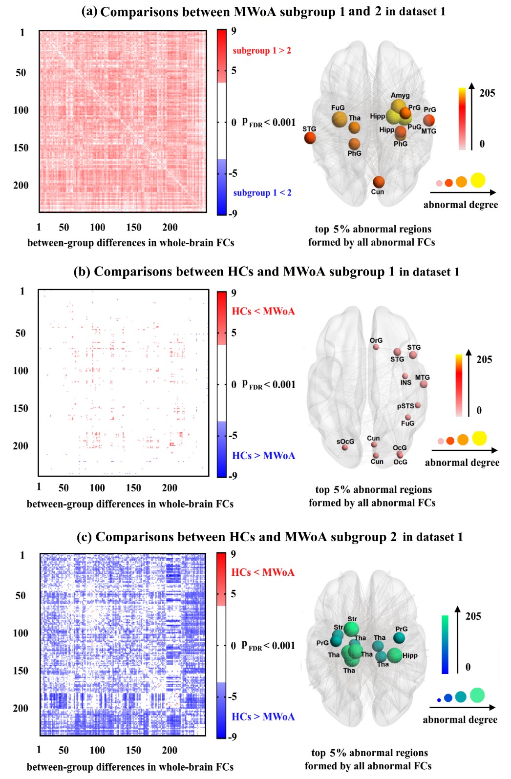 圖1.不同亞組患者大腦功能連接度異常研究結果