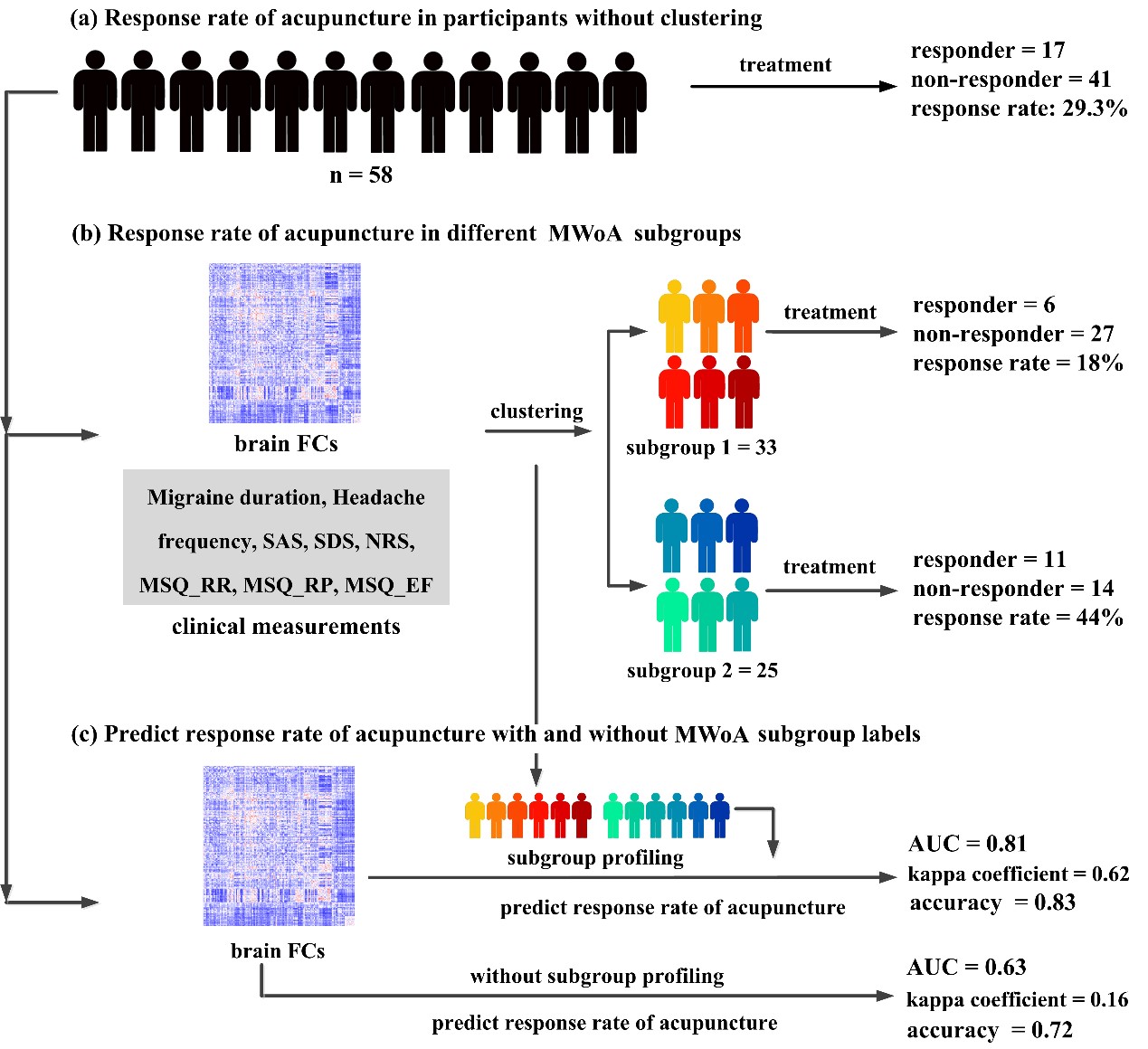 通過綜合患者靜息態下大腦功能磁共振影像及臨床測量分數,研究者患者分成兩個亞組,且不同亞組患者對于針刺治療的響應率不同。這一結果提示:不同亞組偏頭痛患者可能適合不同的治療方案。研究結果不僅可提供定義影像亞型人群的計算策略,幫助研究者更好地理解不同偏頭痛分型的病理生理學機制,同時有助于設計更好的基于影像學特征的針刺個體化治療方案,促進針刺治療偏頭痛機制研究的進一步發展。