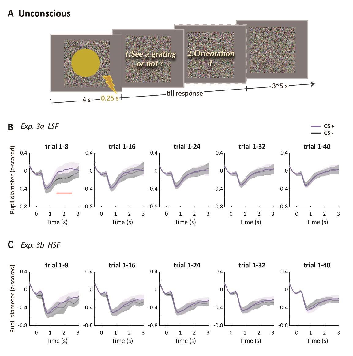 系列實驗結果一致表明,在無意識條件下,情緒中性刺激的恐懼習得依賴于低空間頻率特征,即只具備低頻率成分而不具備高頻率成分的恐懼條件化刺激(CS+)相較于非恐懼條件化刺激(CS-),會引發更強的皮膚電反應(圖1 D-F)和更大的瞳孔擴張 (圖2 B-C)。此外,無意識的恐懼聯結只需幾個試次即可快速習得,但隨著條件化的進程會逐漸習慣化(圖 2 B),當一旦移除US,已建立的恐懼條件化會迅速消退(圖1 E)。相比之下,在意識水平,高低空間頻率的刺激均引發了相似的皮膚電反應差異(圖 1 G),但恐懼習得發生得較慢,在移除US后,這種聯結仍然可以維持一些試次(圖1 H-I)。