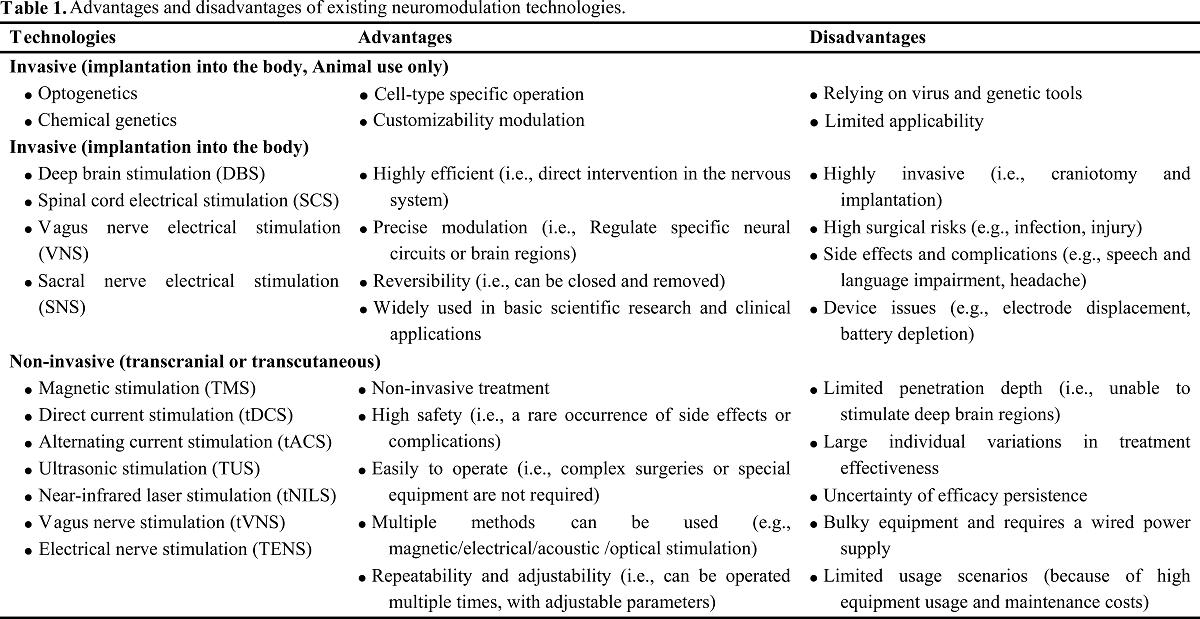 表1. 現有神經調控技術的優點和缺點
