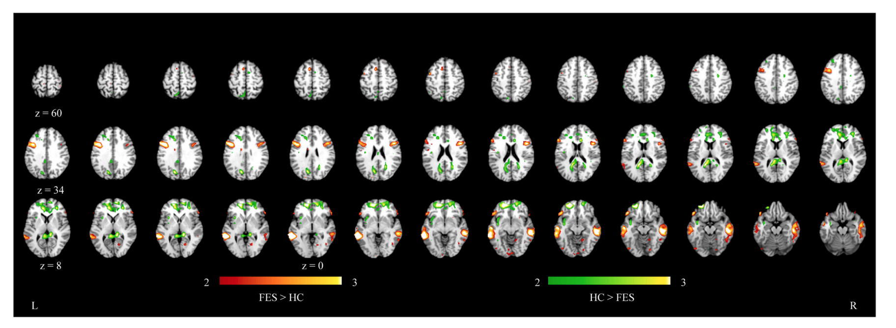 圖2. 首發精神分裂癥患者與健康對照組在幽默與非幽默條件對比中的神經活動差異