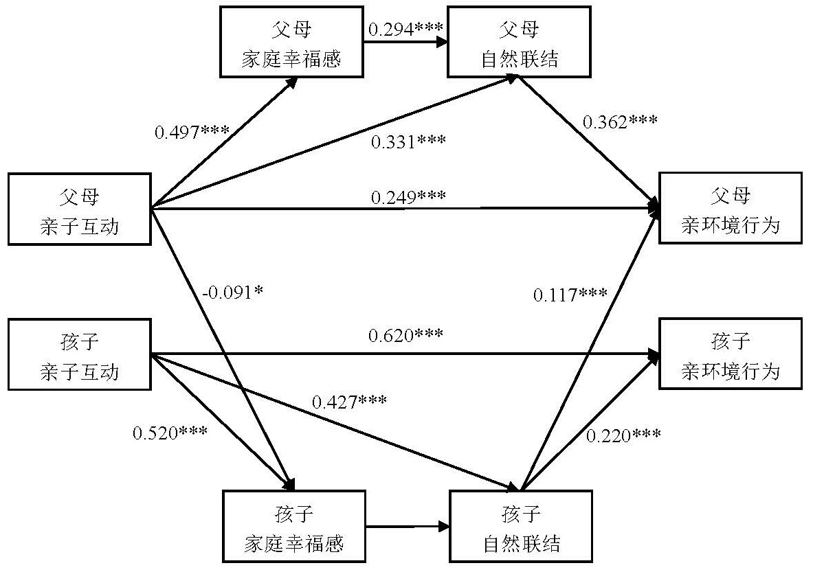 研究發現,親子互動對代際關系和家庭幸福有積極影響,互動程度越高,父母和孩子所感受到的家庭幸福感越強、自然聯結水平越高。幸福的人更有可能表現出親環境行為。因此,人們的親環境行為會受到家庭幸福感的影響,即親子互動增加父母和孩子的家庭幸福感及自然聯結,進而促進親環境行為的提升。