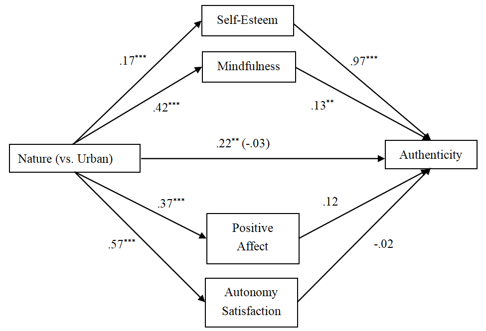 圖3. 自然促進本真性效應的中介路徑圖(研究8)