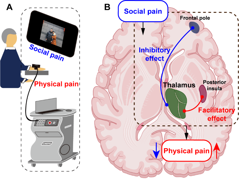 對個體而言,疼痛是一種多維現象,既包括生理上的軀體疼痛,也包括情感上的社會疼痛。軀體疼痛通常與實際或潛在的組織損傷有關,而社會疼痛則與與他人或社會群體的心理距離有關,例如受到排斥和拒絕。雖然已有許多研究關注社會疼痛與軀體疼痛之間的相似性和差異性,但實際的社會疼痛與軀體疼痛之間的相互作用研究相對較少。