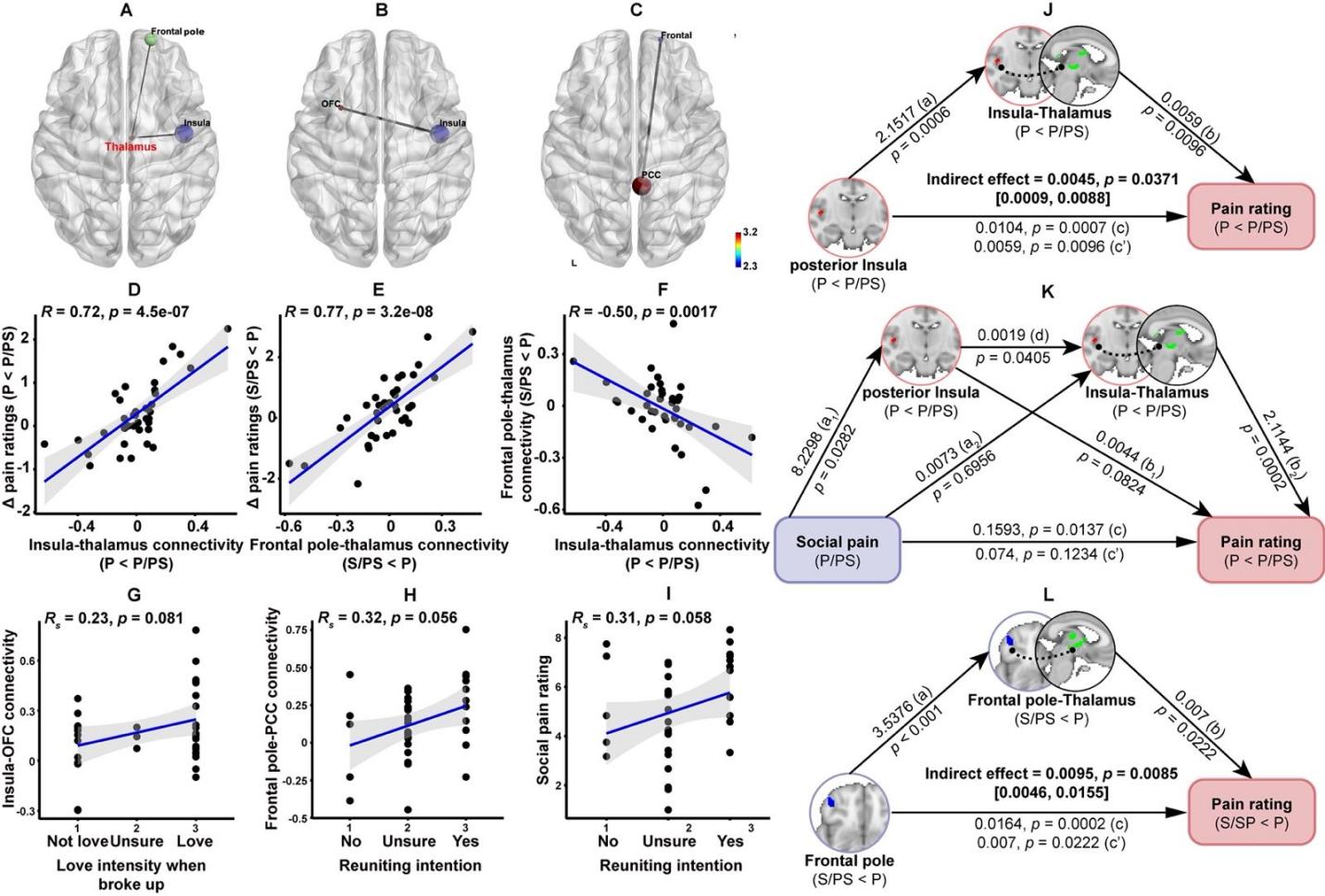 進一步的功能磁共振實驗發現,當人們關注社會疼痛時,社會疼痛對軀體疼痛產生的抑制作用主要與額極有關,而當人們不關注社會疼痛時,社會疼痛對軀體疼痛產生的易化作用與后腦島有關(圖2),而丘腦同時調節抑制和易化兩個過程,在不同的社會疼痛關注狀態下對疼痛感知進行調節 (圖3)。