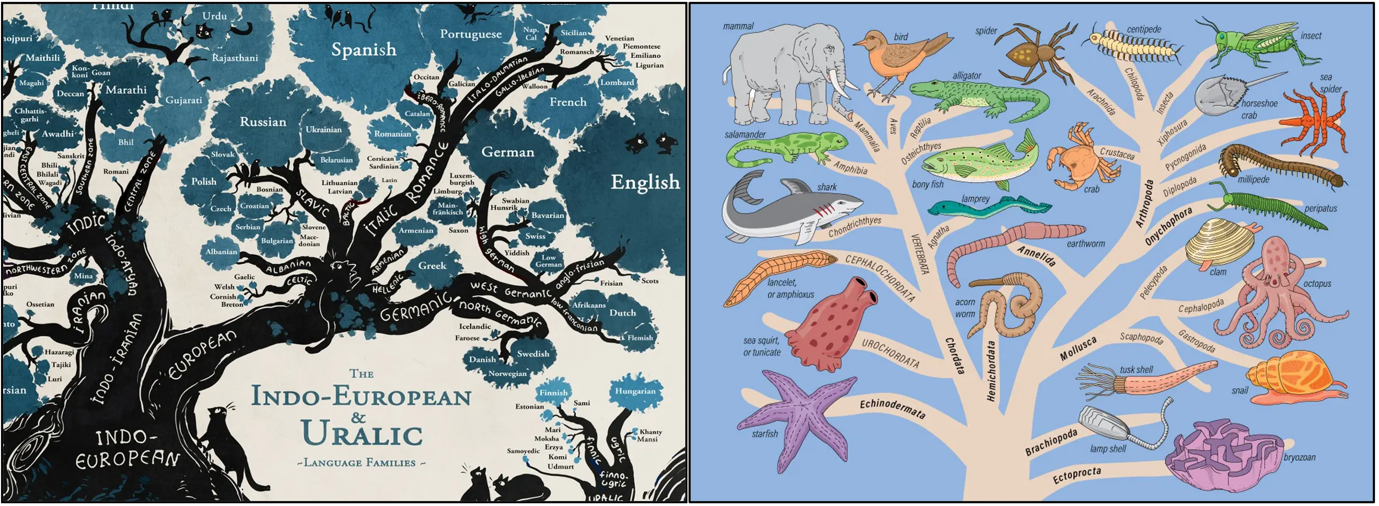 圖1. 語言演化(左)和生物演化(右)。這兩者之間存在許多精巧的類比。比如語言元素對應生物物種;認知選擇對應自然選擇;認知資源對應食物/養分;基因隨機突變對應新詞涌現