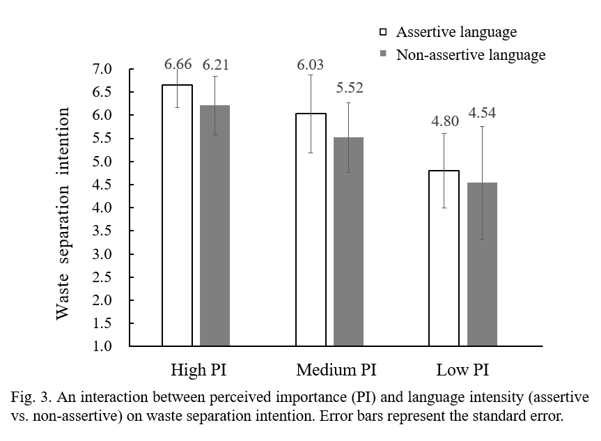 研究發現,感知重要性和語言強度能夠顯著提升人們的垃圾分類意愿(如圖2)。當參與者對垃圾分類的感知重要性較高時,人們更傾向于采取相應的行動。此外,強烈、果斷的斷言性語言表述具有更強的影響力,能更好地說服人們參與垃圾分類。