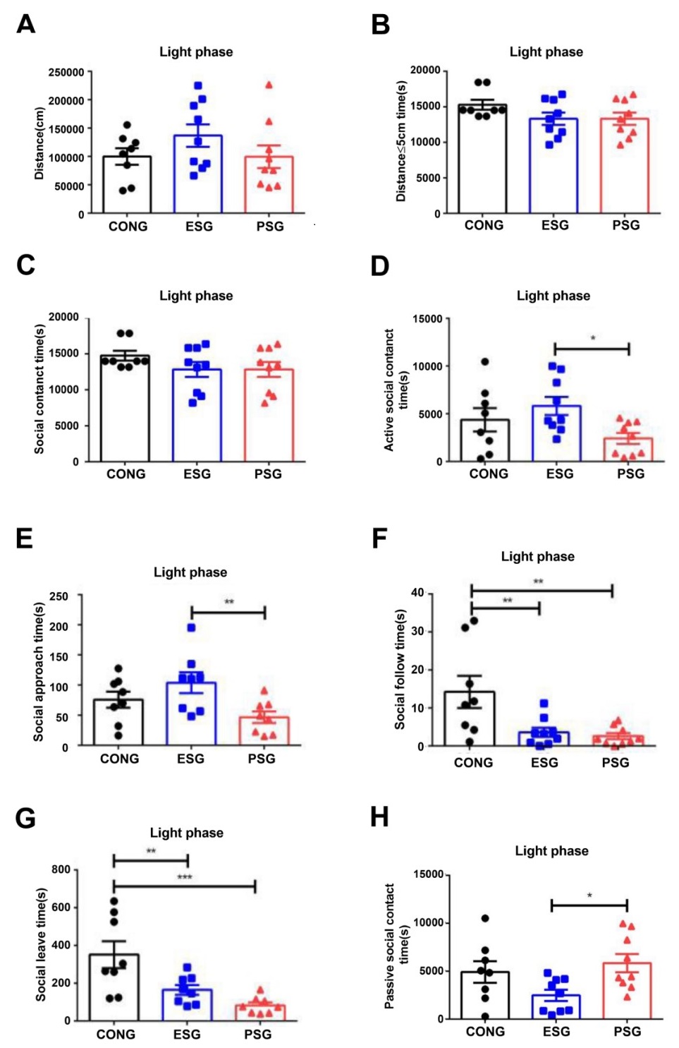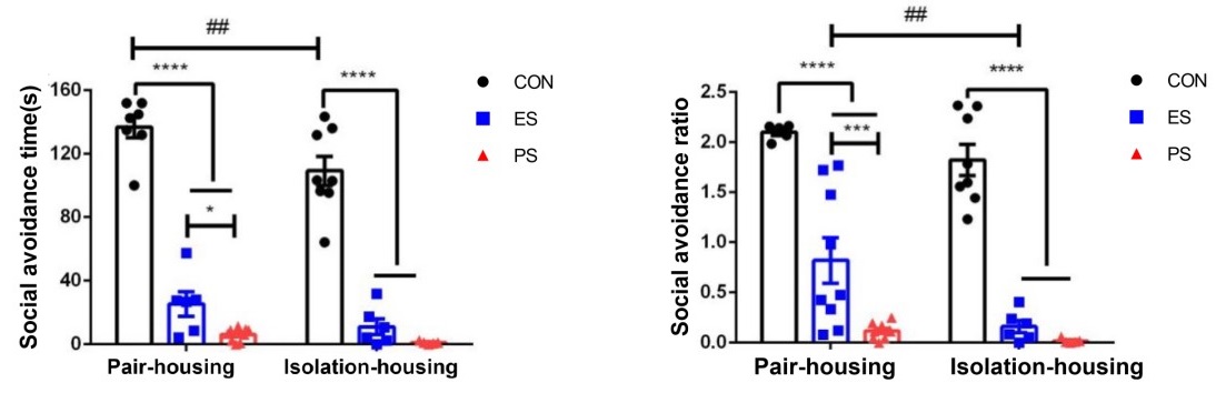 為驗證這一假設,基于前期建立的擬人類兒童青少期同伴霸凌動物模型-社會挫敗應激,中國科學院心理研究所王瑋文研究組通過親歷和目擊社交挫敗構建軀體性或情緒性應激 (PS和ES) 結合群養或隔離飼養條件,研究了應激類型與社會支持對青少期小鼠焦慮行為、社交策略和情緒腦區(包括內側前額葉、外側杏仁核、伏隔核和海馬)小膠質細胞特異的結構性和反應性分子標記(離子鈣結合銜接分子1 (Iba1) 和分化抗原簇11b (CD11b))表達的影響。