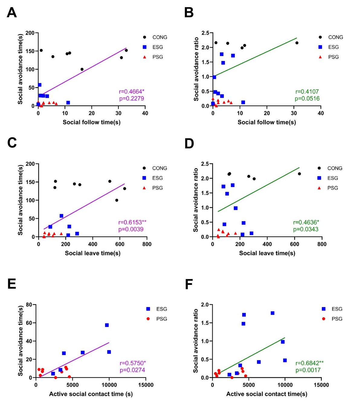 進一步分析不同類型應激動物在群養環境中差異性獲益的原因,發現情緒應激組小鼠與軀體應激組相比在社交互動環境中表現出更多的主動社交策略(如更長時間的社交接觸、社交趨近和社交跟隨)和更少的被動社交策略(消極的社交接觸),但其一般活動性并無差異(圖2)。多個主動社交策略指標與小鼠的社會回避間呈顯著正相關關系(圖3)。