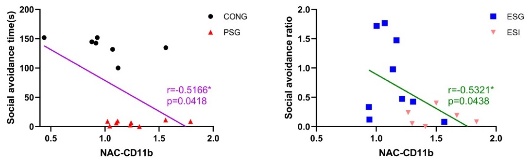 圖5.?社交回避水平與伏隔核小膠質細胞CD11b的表達相關