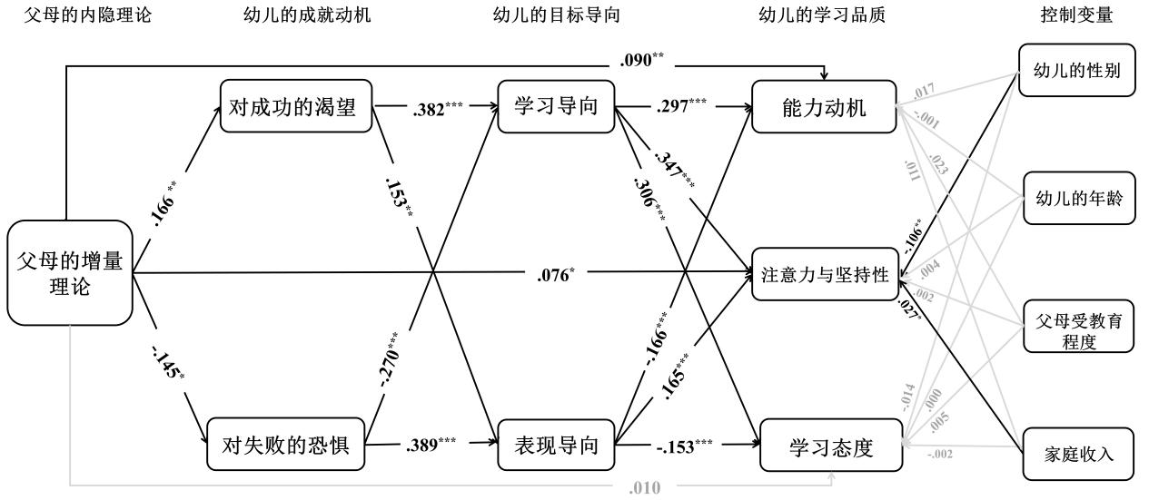 研究結果發現,父母的增量理論與孩子的積極學習品質顯著正相關。父母越相信孩子的智力是高度可塑的,孩子的能力動機越強、注意力和堅持性水平越高、學習態度越良好、學習策略越靈活。此外,孩子的成就動機和目標導向在這一影響過程中起到了連續中介的作用(見圖1)。對成功的渴望(hope for success)與孩子的學習導向(learning goal orientation,專注于掌握和提升能力)和表現導向(performance goal orientation,專注于取得好結果和正面評價)正相關。對失敗的恐懼(fear of failure)則與孩子的學習導向負相關,與表現導向正相關,學習導向有利于積極的學習品質,表現導向則相反。通過這一二階中介路徑,父母持有增量理論的程度越高,孩子便越多地渴望成功,越少地害怕失敗,從而總體上促進了孩子的學習導向,減少了孩子的表現導向,最終有益于孩子形成積極的學習品質。