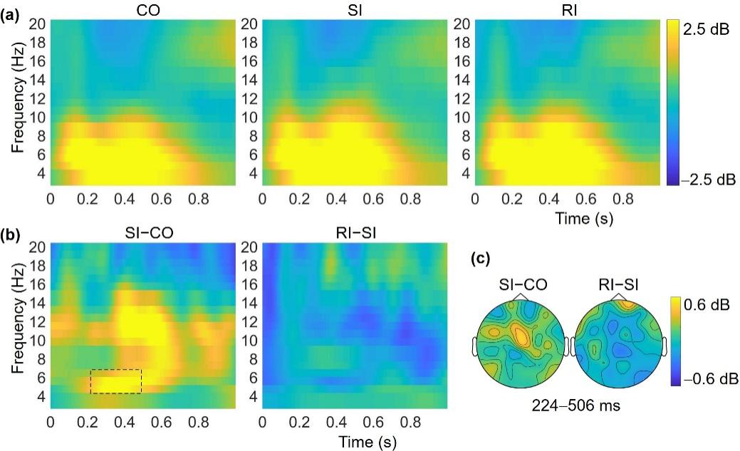 在神經振蕩上,研究者發現,額中theta能量的增強只受語義沖突調制。這一結果可能反映了大腦需要更多的認知控制資源來監測和解決語義沖突。根據事件編碼理論,先呈現的聽覺刺激增強了事件文件(event file)中任務無關刺激特征的編碼,使得事件文件中刺激選擇的競爭更強,從而導致了額中theta能量在語義沖突中增強。