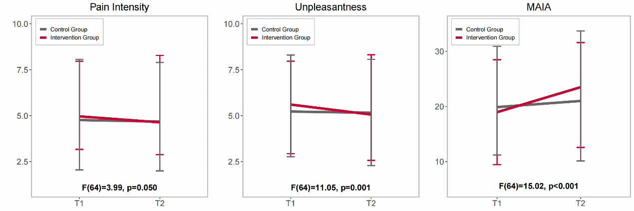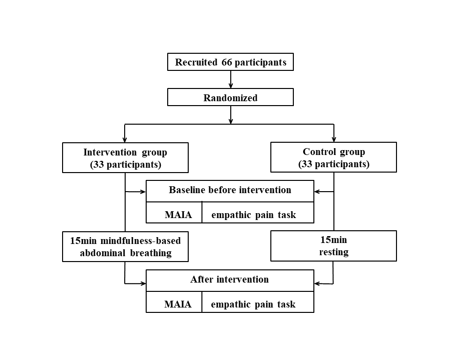研究采用隨機對照試驗(RCT)設計,分為干預組和對照組。干預組進行了15分鐘的腹式呼吸干預訓練,對照組休息15分鐘且不進行任何干預。在基線和干預結束,分別測量了所有被試在觀看他人疼痛圖片后的疼痛強度和不愉悅度評分,以及內感受敏感性(MAIA)得分。