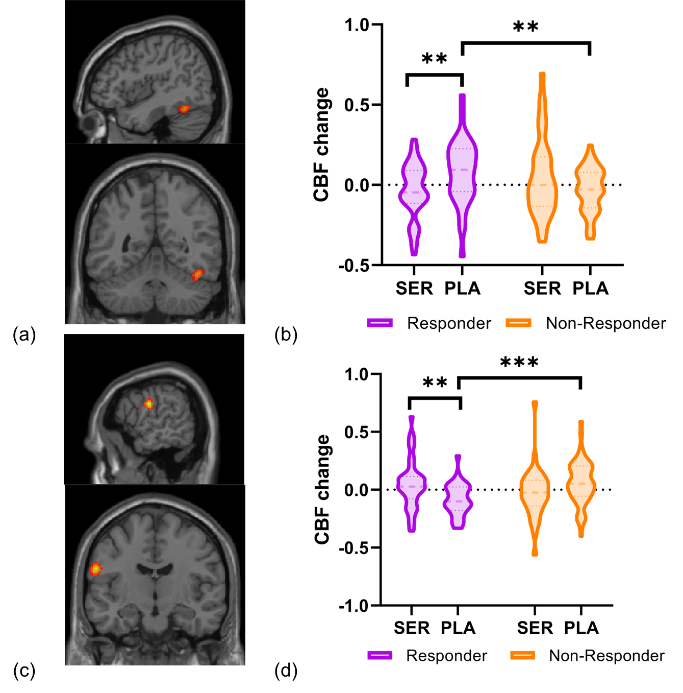 圖1:治療方式與療效的交互效應。舍曲林反應組和非反應組、安慰劑反應組和非反應組在顳葉(a)與中央后回區(c)存在顯著的治療×時間交互作用。(b)和(d)顯示了治療早期腦血流量變化在舍曲林反應組和非反應組之間以及安慰劑反應組和非反應組之間的事后t檢驗結果,星號**代表p < 0.01,***代表p < 0.001。