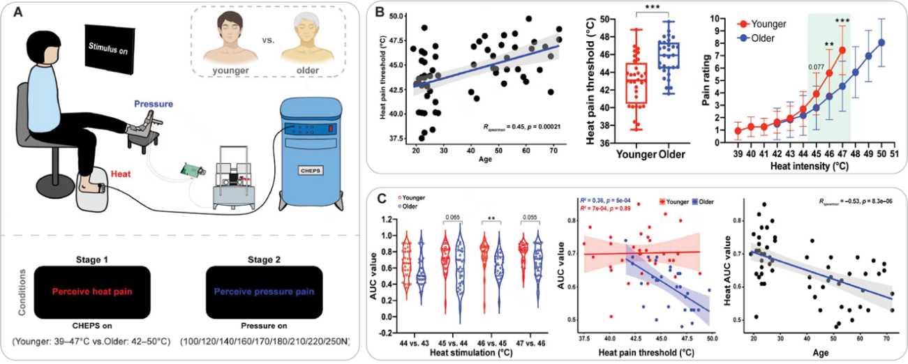 研究者招募了不同年齡范圍的年輕人和老年人兩組被試進行實驗,對兩組人群的左右腳分別施加依賴于小纖維傳導的熱刺激和依賴于大纖維傳導的壓力刺激,并記錄了被試對這兩種刺激疼痛閾值,以及他們對每種刺激九個遞增強度刺激的疼痛感受(圖1A)。