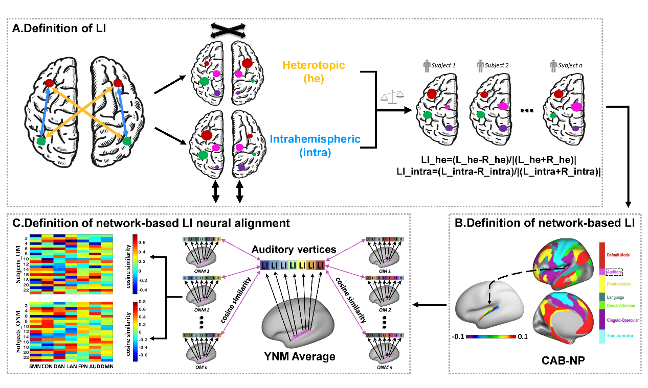 圖 1 研究流程圖。A. 腦功能偏側化定義。LI_intra: 半球內功能連接偏側化;LI_he: 半球間異位功能連接偏側化。B. 基于腦網絡的功能偏側化定義。CAB-NP: Cole-Anticevic Brain-wide Network Partition. SMN:感知運動網絡;CON:傘蓋網絡;DAN:背側注意網絡;LAN:語言網絡;FPN:額頂控制網絡;AUD:聽覺網絡;DMN:默認網絡。C. 基于腦網絡功能偏側化的神經齊性定義。OM:老年音樂家;ONM:老年非音樂家;YNM:青年非音樂家。