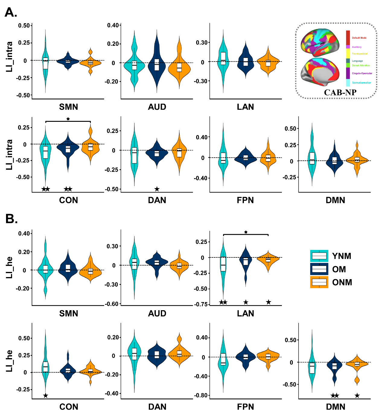 圖 2 三組被試的腦網絡功能偏側化。A. 半球內功能連接偏側化LI_intra。B. 半球間異位功能連接偏側化LI_he。CAB-NP: Cole-Anticevic Brain-wide Network Partition. SMN:感知運動網絡;CON:傘蓋網絡;DAN:背側注意網絡;LAN:語言網絡;AUD:聽覺網絡;DMN:默認網絡;FPN:額頂控制網絡。YNM:青年非音樂家;ONM:老年非音樂家;OM:老年音樂家。* FDR-corrected or Games-Howell-corrected P < 0.05. ★FDR-corrected P < 0.05, ★★FDR-corrected P < 0.01。