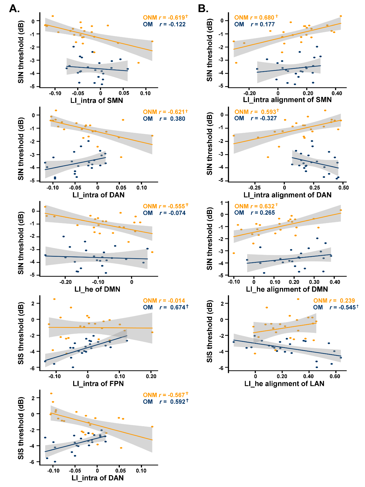 圖3 老年人腦功能偏側化及其神經齊性指數與噪音下言語識別任務的相關。A. 腦功能偏側化與噪音下言語識別任務的相關。B. 腦功能偏側化神經齊性指數與噪音下言語識別任務的相關。LI_intra:半球內功能連接偏側化;LI_he:半球間異位功能連接偏側化。SIN:噪聲掩蔽下言語識別任務;SIS:語音掩蔽下言語識別任務。SMN:感知運動網絡;DAN:背側注意網絡;DMN:默認網絡;FPN:額頂控制網絡。LAN:語言網絡。ONM:老年非音樂家;OM:老年音樂家。