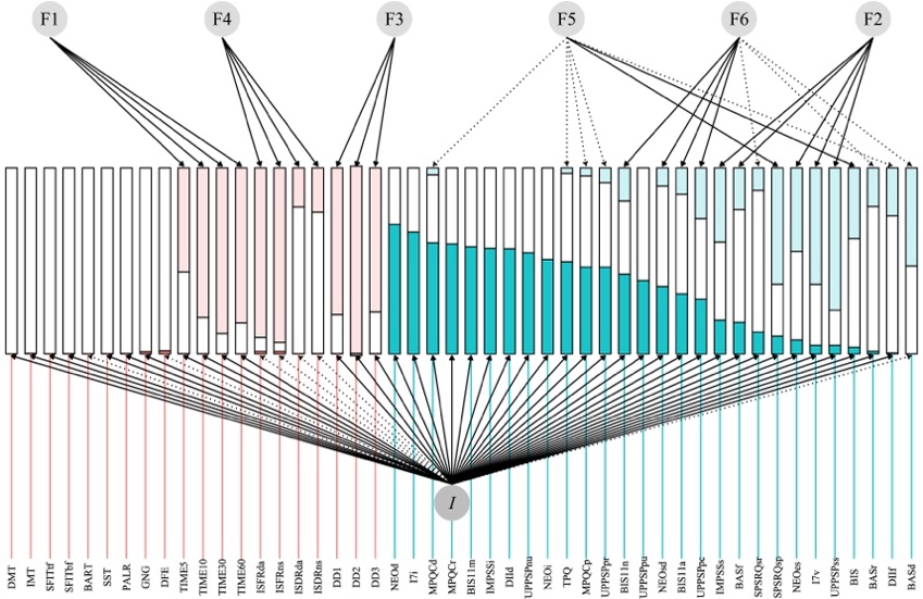 圖1. 沖動性的雙因子模型。藍色為自我報告量表指標,紅色為行為測量指標。I代表提取的一般沖動性因子,F1至F6為特殊因子。每個指標條上部的淺色部分代表可由特殊因子解釋的變異;下部的深色部分代表可由一般因子I解釋的變異;中間的白色部分代表無法被解釋的變異。虛線箭頭表示負載荷,實線箭頭表示正載荷