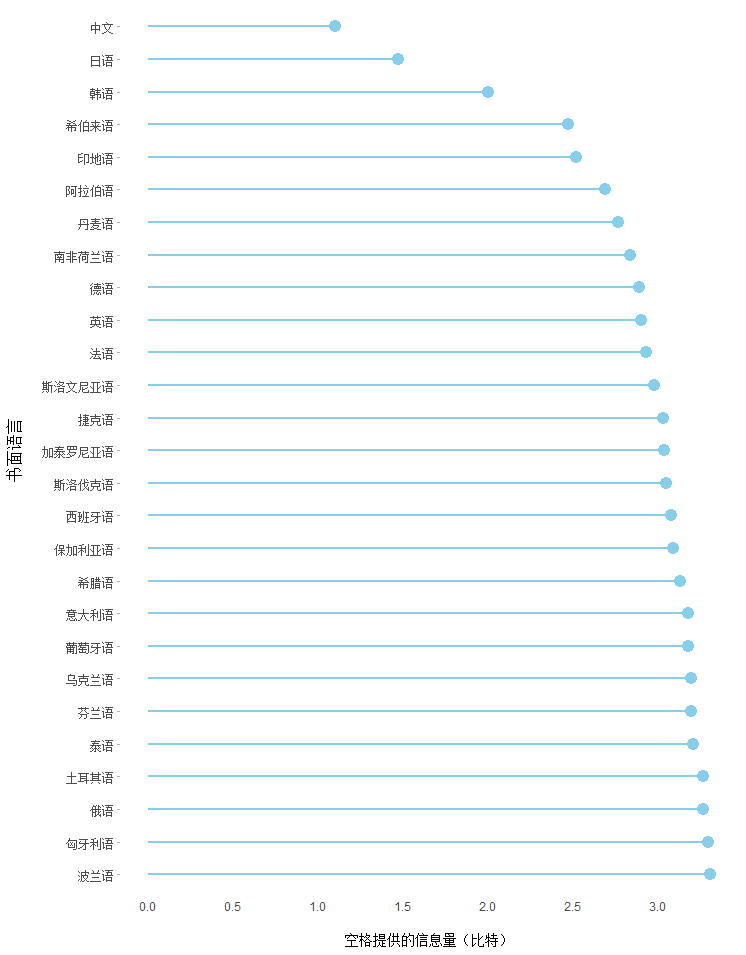 圖2二十七種語言中詞間空格為確定詞邊界提供的信息量